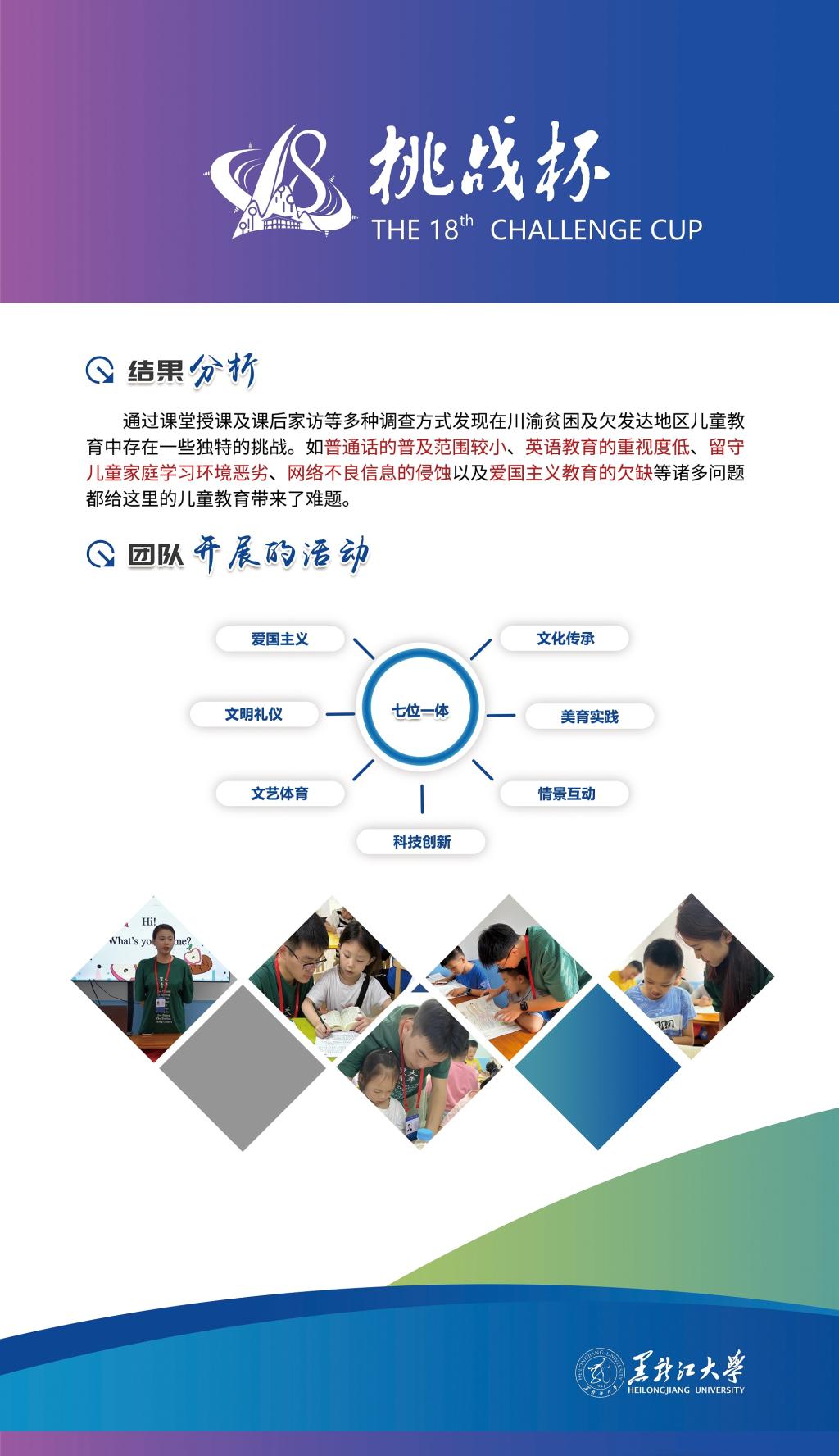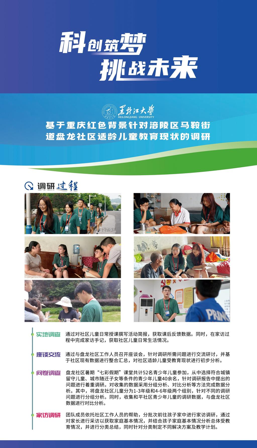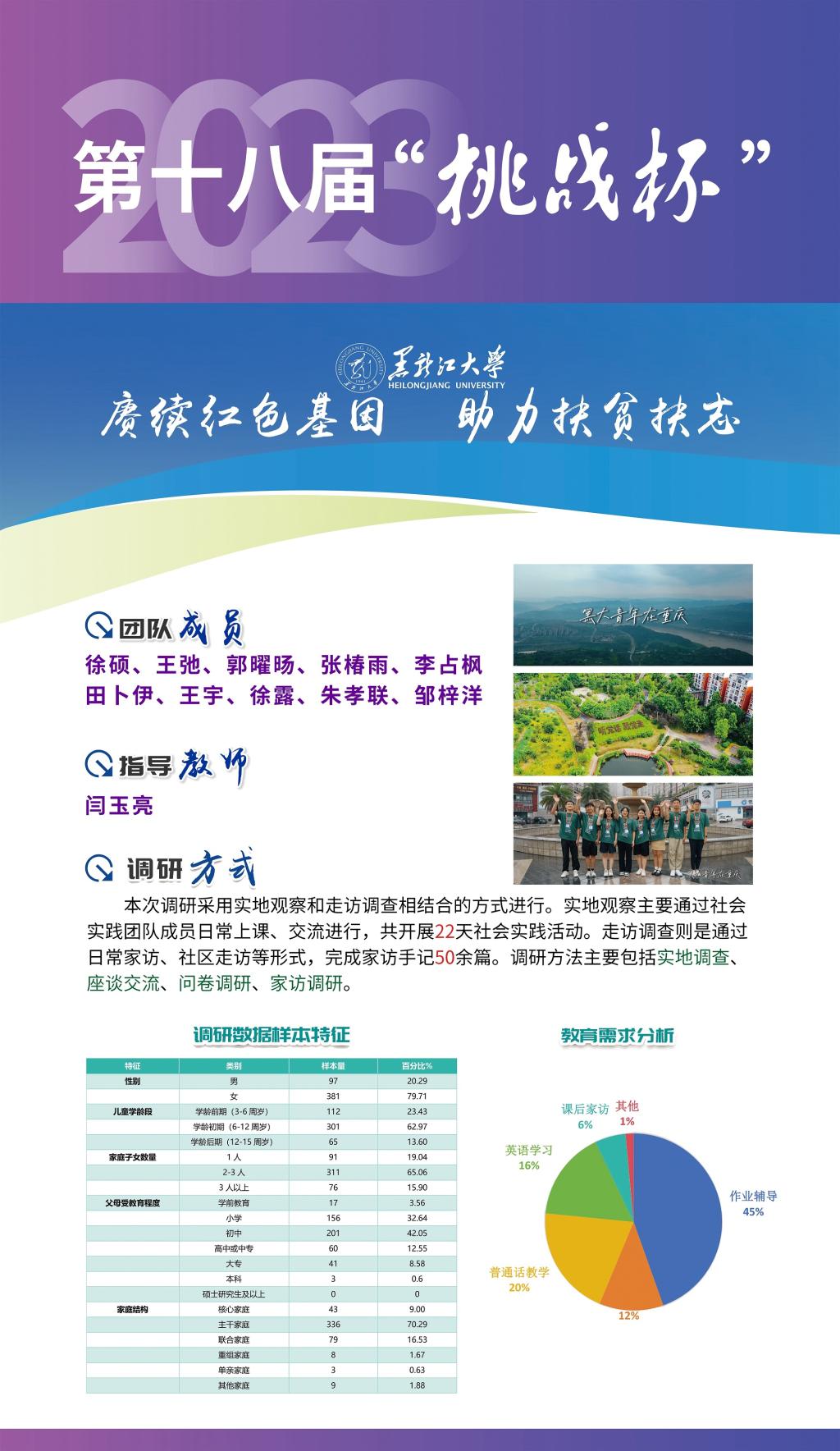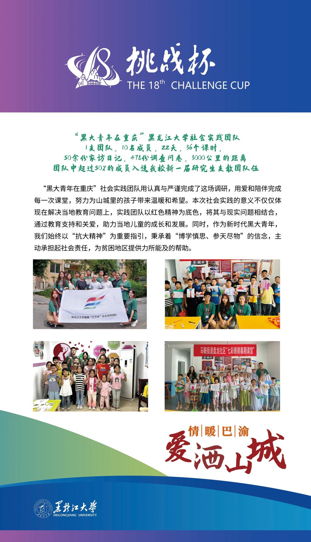 必赢作品《赓续红色基因 助力扶贫扶志——“七彩假期·黑大青年在重庆”必赢242net官网三下乡社会实践团队基于重庆红色背景针对重庆市涪陵区马鞍街道盘龙社区适龄儿童教育现状调研》在终审决赛中取得突破性成绩,在红色专项赛中经过现场答辩,荣获一等奖,这是必赢参加“挑战杯”竞赛以来首次获得国家级一等奖,创造了必赢参加“挑战杯”竞赛的最好成绩,此项目也是黑龙江省本科高校参加“挑战杯”红色专项赛作品中唯一获得一等奖的作品。此外,必赢作品《乡村振兴背景下“新农村”发展路径研究——以查罕诺村和扎龙村为例》获得三等奖。