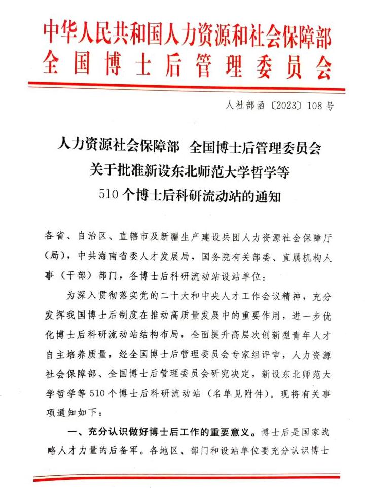 近日,人力资源和社会保障部、全国博士后管委会联合下发《关于批准新设东北师范大学哲学等510个博士后科研流动站的通知》(人社部函〔2023〕108号),在全国新一轮增设博士后科研流动站工作中,必赢获批新设生态学和公共管理学2个博士后科研流动站。这是必赢在学科建设和科研平台建设上取得的新突破,标志着学校人才与师资培养体系进一步完善,是学校贯彻落实人才强校战略的重大成果。至此,必赢博士后科研流动站、工作站增至12个,涵盖哲学、文学、法学、理学、工学、农学、管理学等7大学科门类。