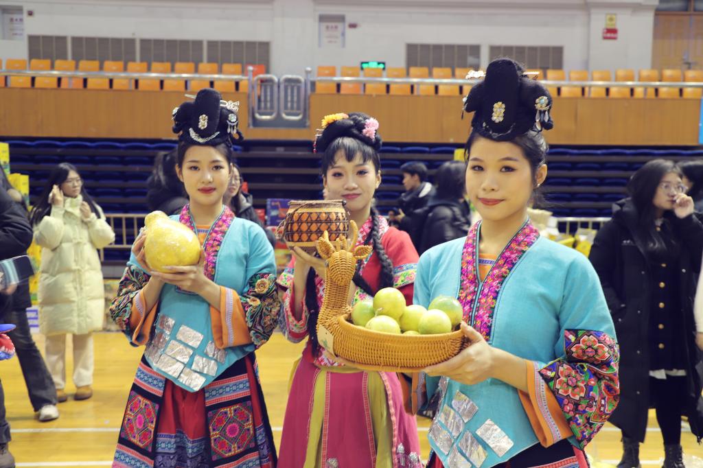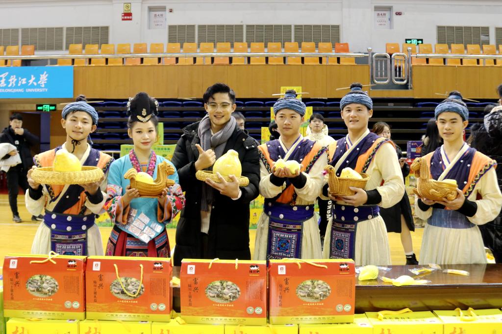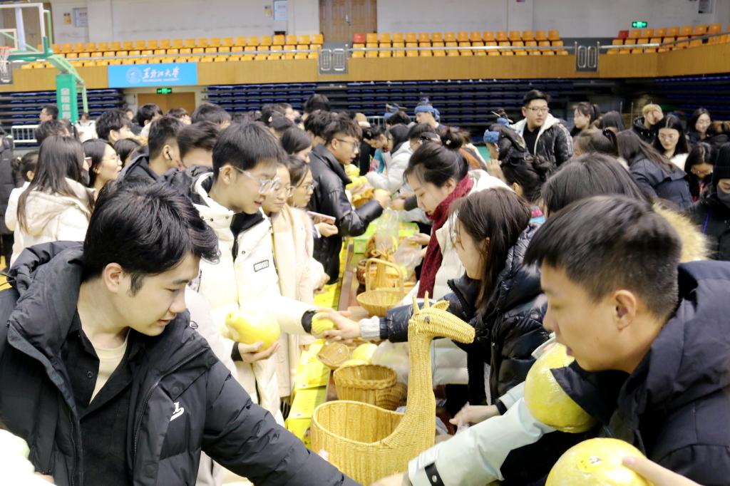 活动现场,广西玉林的“小柚子”们还为师生们发放了沙田柚、百香果等广西特产。