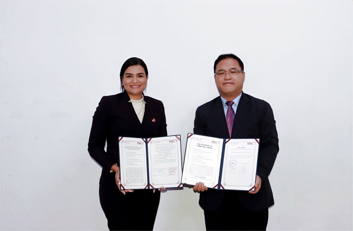 井立强副校长致辞。他对圣多明各理工大学孔子学院院长瓦妮莎的到来表示欢迎,并向瓦妮莎介绍了学校的基本情况,尤其是国际中文教育与国际交流方面的发展。学校设有国家语言文字推广基地,并与俄罗斯、多米尼加两国合作建设了当地首所孔子学院,近10年间孔子学院注册培训学员超万名,为汉语推广和中华文化传播作出了重要贡献。他表示,学校将以服务国际中文教育事业发展、促进中国与多国实现共同发展为宗旨,继续大力支持孔子学院的发展,愿与多方一道将圣多明各理工大学孔子学院搭建成中国与多米尼加共和国民心相通的桥梁。