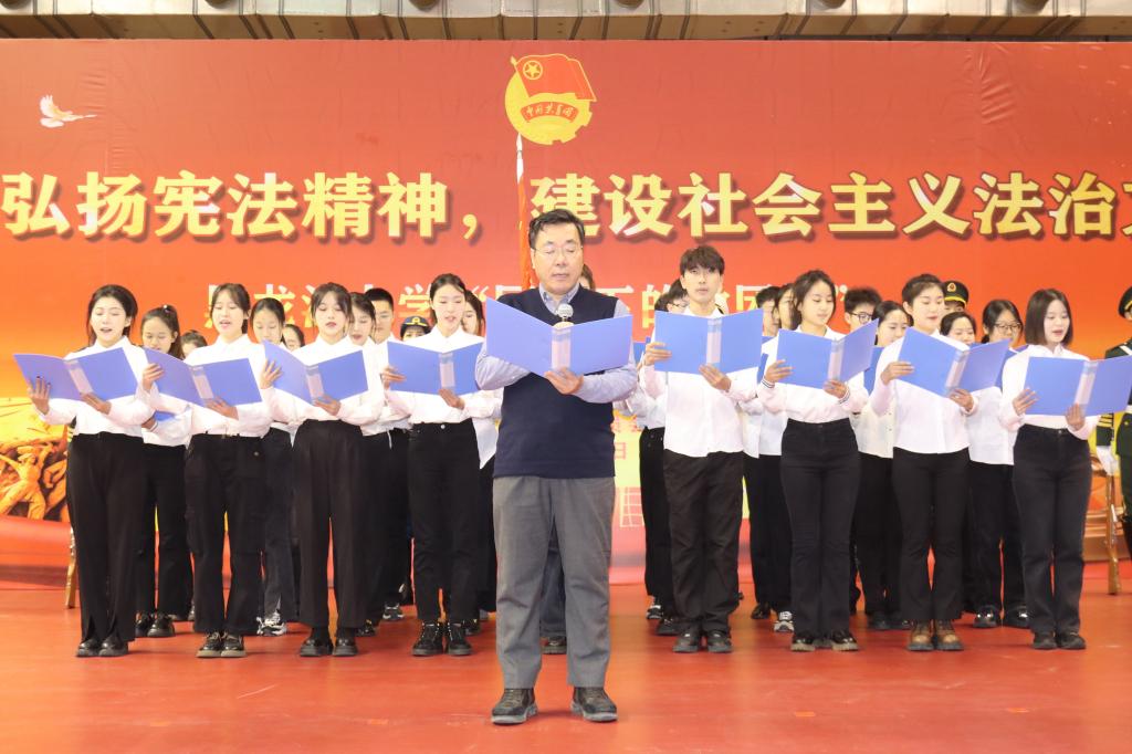 仪式上,法学院副院长李岩松带领全体同学进行宪法晨读。同学们跟读宪法部分章节,句句铿锵有力,声声入耳,字字入心。