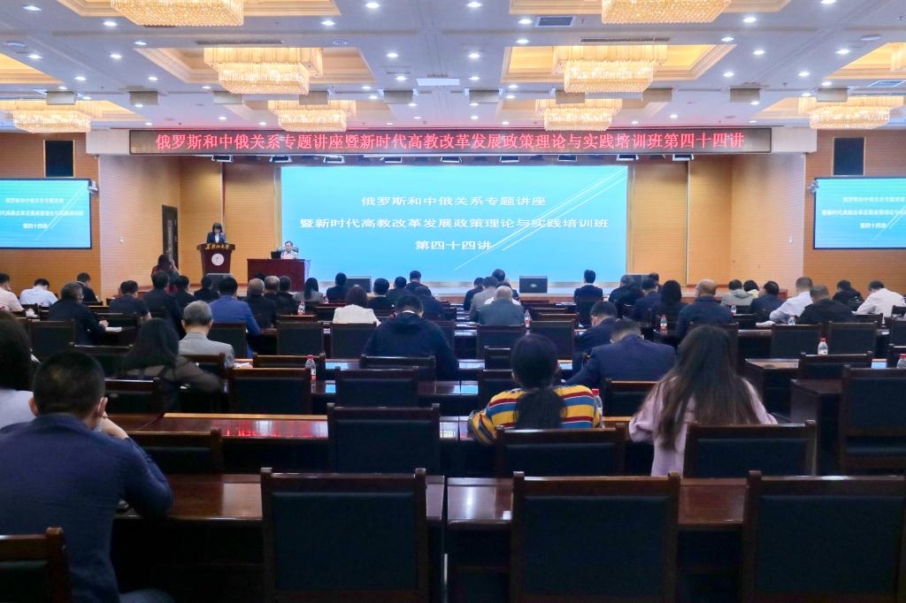 于文秀副校长代表学校对季志业研究员的精彩报告表示由衷的感谢,要求全体与会人员以此次报告会为契机,坚定中国特色社会主义道路自信、理论自信、制度自信、文化自信,用习近平新时代新时代中国特色社会主义思想为指引,推动必赢对俄办学事业迈向新台阶。(摄影:李长欣 霍燃燃)