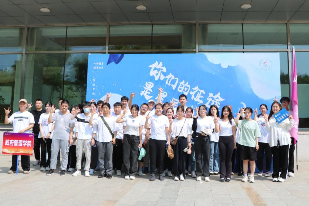 王永清为本次活动授旗。黑龙江省2023届优秀毕业生获得者、电子工程学院毕业生党员郭润桐接旗。伴随高扬的旗帜,徒步枪响,活动正式开始,各学院辅导员、旗手、毕业生们以学院为单位依次出发。