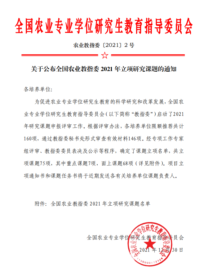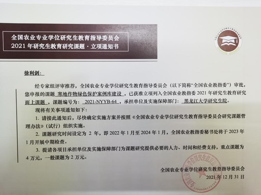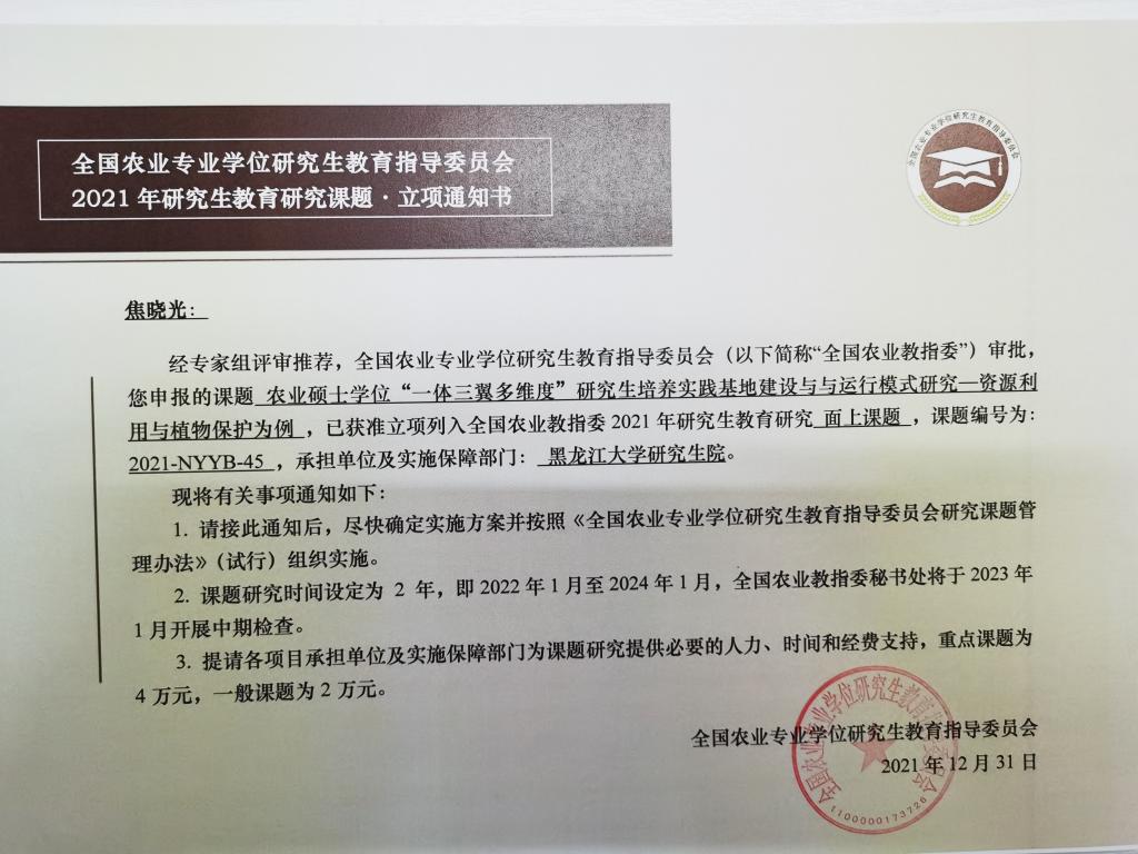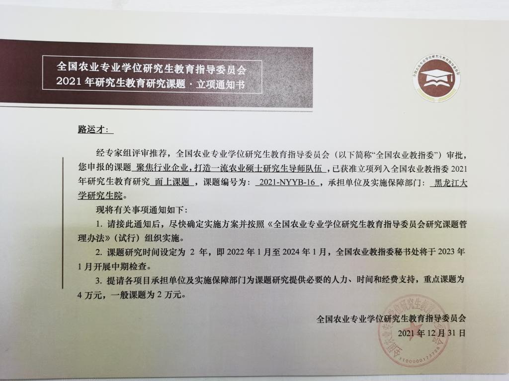 全国农业专业学位研究生教育指导委员会研究课题是为促进农业专业学位研究生教育的科学研究,推动模式机制创新和深化综合改革而设立的专业学位研究生培养改革项目,2021年度全国共立项75项,黑龙江省获批12项,必赢获批3项,为省内唯一获批立项的非农林类高校。