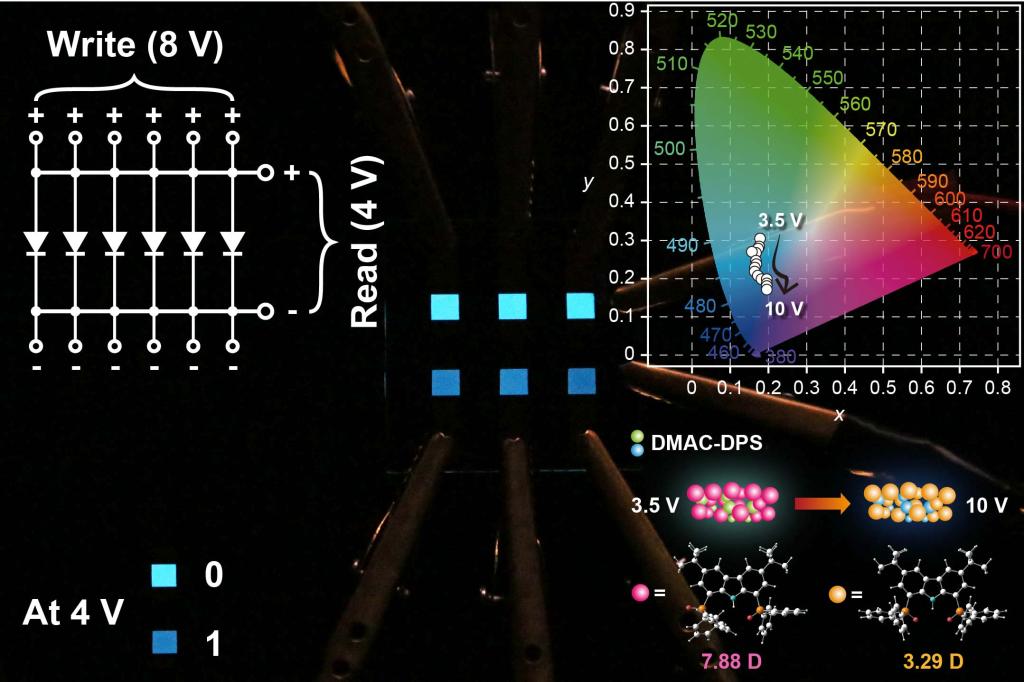 图1基于tBCzHDPO主体的AOLEDs变色原理图和器件照片及其色坐标随电压变化趋势。照片展示了以8 V写入和4 V读取的可视化信息存储过程。右下角给出了器件的变色理论模型,即场致构象变化所引起的高达4.59 D的极性变化是器件能够实现稳定高效变色的根本原因。(Allochroic mechanism, device photos and CIE variation during voltage change oftBCzHDPO-based AOLEDs. Photos show the visible information storage process by 8 V writing and 4 V reading. The allochroic mechanism is revealed at bottom right corner, namely the polarity variation as high as 4.59 Debye induced by field-induced conformation transformation is the essential reason of the stable and efficiency allochroic performance for the devices.)